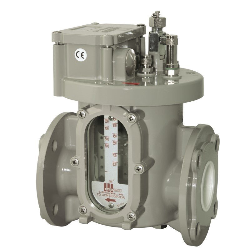 The Cedaspe EB080R27N is an Italian-manufactured Buchholz relay for use on 80 mm pipe flanges of oil-immersed transformers. It detects internal faults via gas accumulation and oil flow sensing, generating alarm and trip outputs. This model features a sealed housing suitable for outdoor installation in harsh environments.
