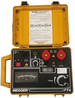 The Megger FT4 Flash Tester is a 4 kV dielectric withstand (flash) tester used to perform high-voltage proof tests on insulated products and cables. It applies a precisely controlled test voltage and trips automatically upon detecting a flashover or excessive leakage current. The instrument complies with IEC and BS safety standards for dielectric testing.