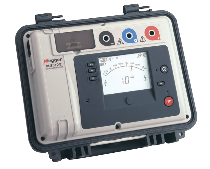 The Megger MIT510-2 is a 5 kV insulation resistance tester with multiple test voltage settings and automated PI and DAR testing capabilities. It performs step voltage tests and time-resistance measurements for a full assessment of insulation condition on HV cables and rotating machines. The instrument features a large backlit display and onboard result storage.