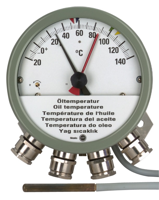The Messko MR MT-ST160 SK/TT is a combined oil temperature gauge (SK) with thermal image winding temperature indicator (TT) function, manufactured in Germany. The SK/TT variant uses an external heater element (energised by transformer load current) to simulate winding hotspot temperature above the measured oil temperature. This single instrument provides both top oil and winding hotspot temperature indication with multiple alarm contacts.