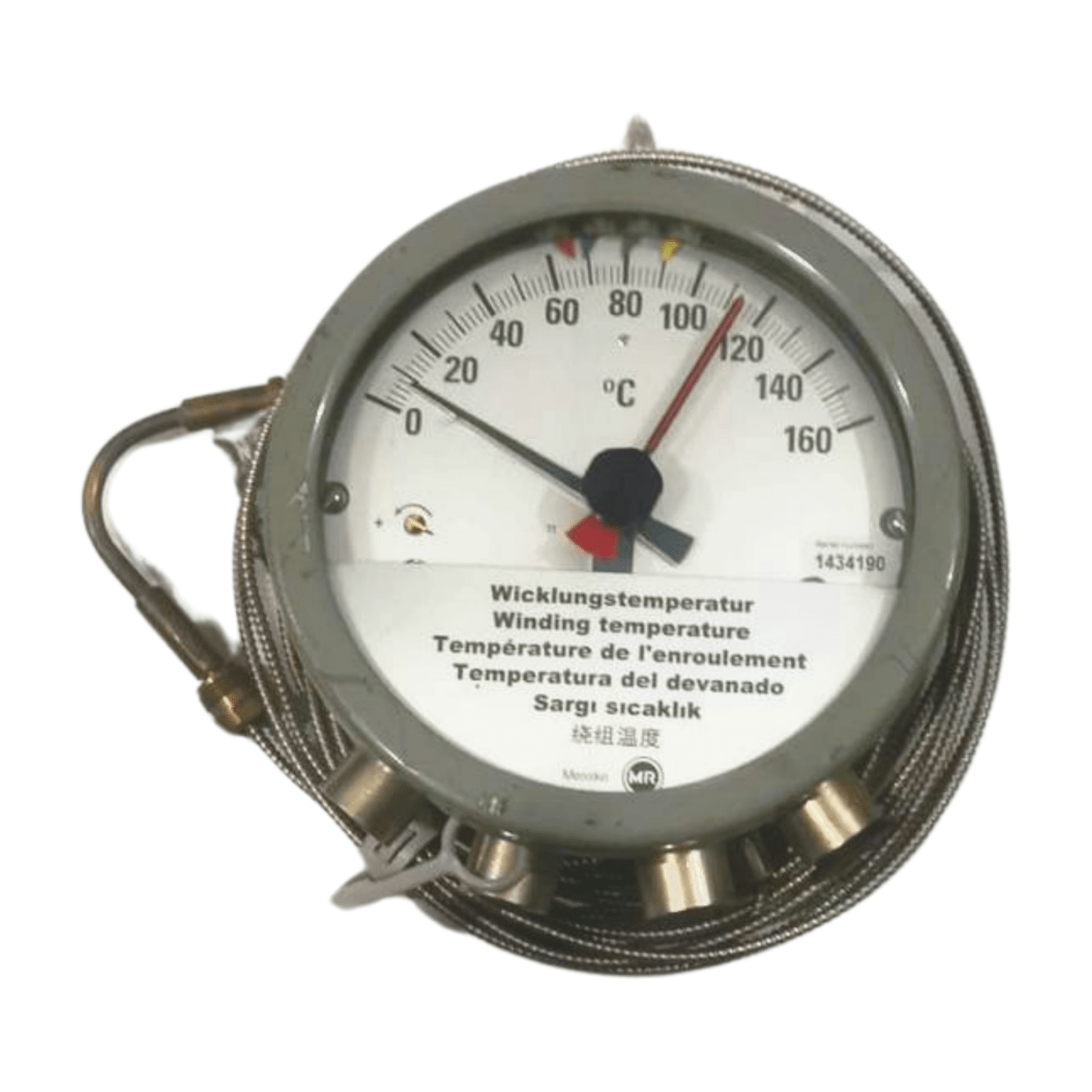 The Messko MR MT-st-WWR/TT/6/12M (160°C) is a winding temperature gauge manufactured by MR Germany with remote sensing capability via Pt100 RTD and thermal image heater, using a 6 or 12-metre capillary tube rated to 160°C. It provides analogue dial indication of winding hotspot temperature and includes microswitch contacts for alarm and trip functions. The dual sensing method ensures accurate hotspot temperature emulation as required by IEC 60076-2.